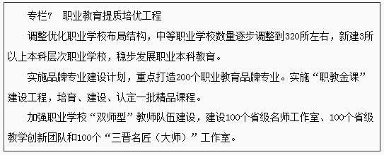 把中等职业教育作为普及高中阶段教育和建设山西特色现代职业教育体系的重要基础,保持普通高中与中等职业教育规模大体相当。设区市统筹做好区域内中等职业学校资源整合、布局调整工作,解决“空、小、散、弱”问题。实施中等职业学校达标计划,各县(市、区)建好办强1所公办中等职业学校。实施省级高水平中等职业学校建设计划,立项建设50所省级高水平中等职业学校,建设一批特色学校,建成一批优秀中等职业学校和优质专业,引领带动中等职业教育改革创新发展。