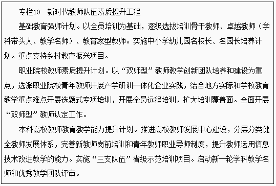 加快提升师范类院校综合实力,分级分类开展师范类专业认证,持续提高师范类专业人才培养质量。鼓励高水平综合性大学开展教师教育,加强教育硕士、教育博士专业学位授权点建设,提高教师培养层次。推动地方政府、高校与中小学协同开展教师培养培训,实现职前与职后相互衔接,逐步形成以师范院校为主体、高水平综合性大学参与、优质中小学校为实践基地的现代教师教育体系。加强中小学校长培训力度,培育教育家型优秀校长。支持高校探索教师发展体制机制改革,完善教师发展中心建设,系统组织教师研修提高。坚持引育并举,加快高层次人才队伍建设,不断培养造就优秀教学科研团队。