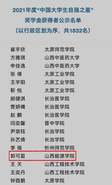 近日由共青团中央、全国学联指导,中国青年报社、新东方教育科技集团、中国青年创业就业基金会联合举办的2021年度“中国大学生自强之星”奖学金评选结果揭晓,经学校推荐、省级初评、全国评审等环节,我系2019级测绘工程专业郭可盈同学荣获2021年度“中国大学生自强之星”奖学金。