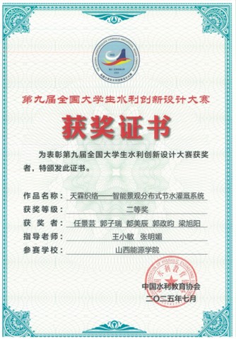 近日,第九届全国大学生水利创新设计大赛在南京圆满落幕。经过激烈角逐,由TapTap地质与测绘工程系地下水专业学生任景芸、郭子瑞、都美辰、郭政昀、梁旭阳同学组成的参赛团队,指导老师王小敏、张明媚凭借作品《天霖织络——智能景观分布式节水灌溉系统》脱颖而出,荣获全国二等奖的佳绩!也是TapTap地下水科学与工程专业学生专业比赛零的突破。