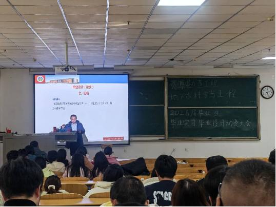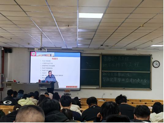 为进一步做好资源勘查工程专业、地下水科学与工程专业2026届毕业生的毕业实习、毕业设计(论文)工作,地质与测绘工程系于2025年12月26日召开了资源勘查工程、地下水科学与工程专业毕业实习、毕业设计(论文)动员大会。系党总支书记姚晓东,副主任田正杰,资勘教研室及地下水教研室全体教师,资勘专业及地下水专业26届毕业班辅导员以及26届全体毕业生参加了会议,动员大会由资勘教研室主任李祥主持。
