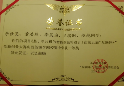 2019年5月底参加第五届全国“互联网+”创新创业大赛校级初赛,经过系赛、校级初赛、校级决赛,在我系老师的指导下,李佳亮团队“基于单片机的智能保温箱设计”获得校级一等奖。