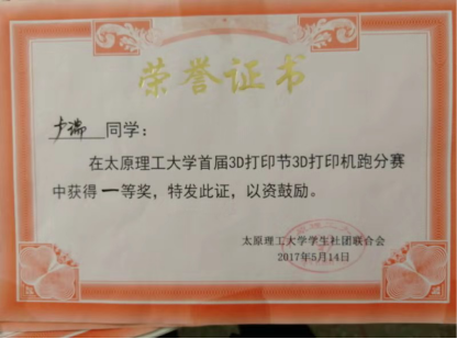2018年5月26日,太原理工大学明向校区举办了“太原理工大学第二届3D打印节”活动,电气系电子科技制作协会代表学院参加了活动的3D打印机“DIY机器跑分赛”,并取得第一名的优异成绩,赢得奖品3D打印机一台。