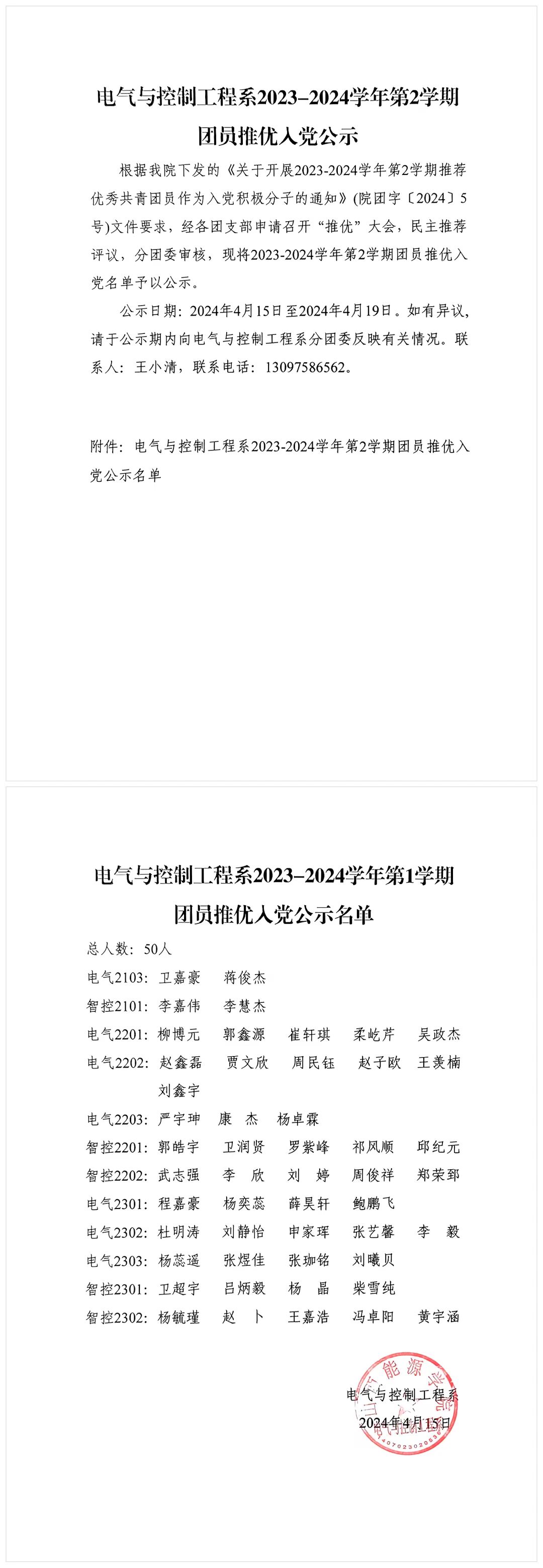 电气与控制工程系2023-2024学年第2学期入党推优公示