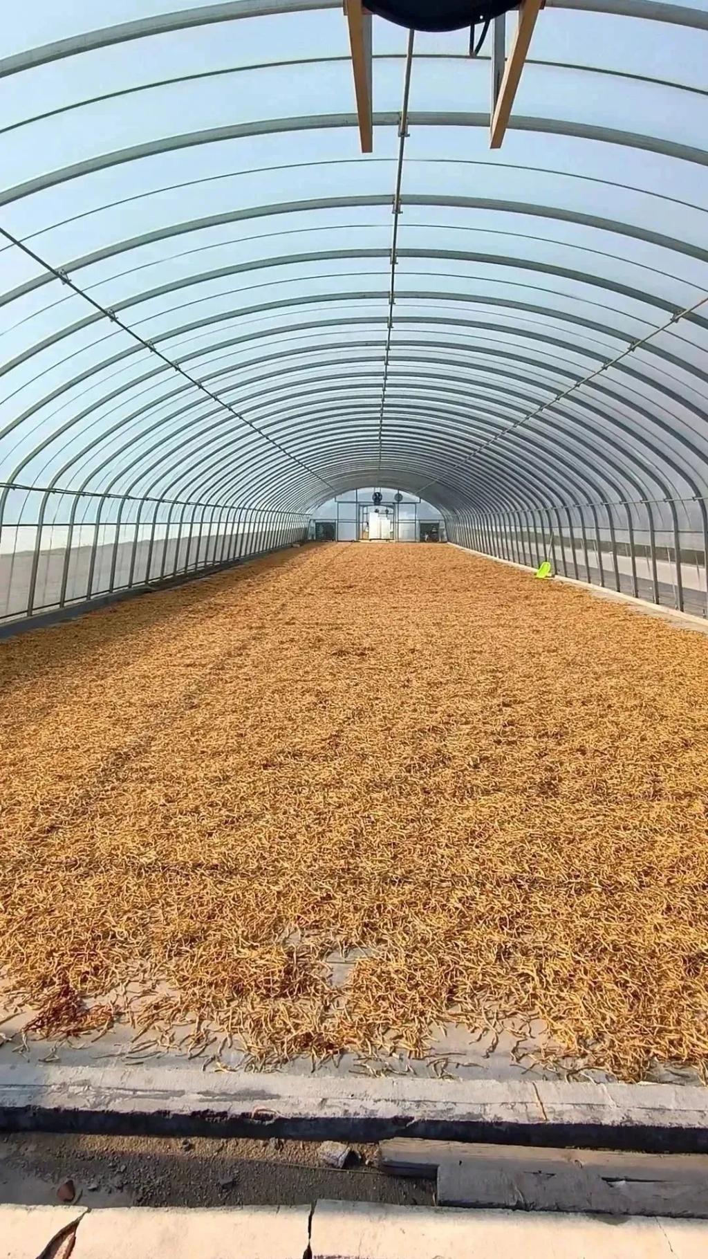 第四步,将黄花均匀撒在空地上,进行晾晒,晾晒结束后将其装盘放入冷库保存。