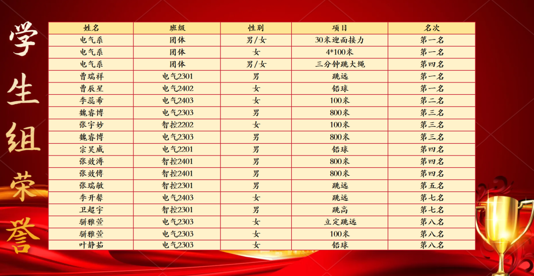 赛场上的旋律,如旋风般急速,如号角般激扬,如激流般奔流不息。我系学生运动员充分展现了电气与控制工程系学子的风采。