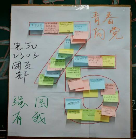 互动环节,电气2303团支部让同学们在便利贴上写下对祖国的祝福,将对祖国的祝福具象化为“75”。