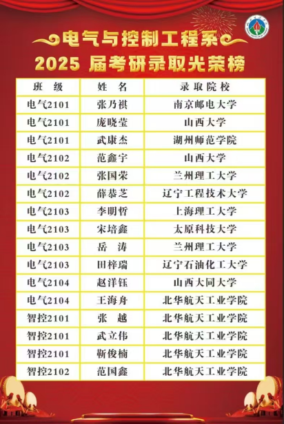 春风得意启新程,踔厉奋发写华章。近日,电气与控制工程系2021级学生在2025年硕士研究生考试与电网招聘考试中捷报频传,喜讯连连,充分展现了我系优良的学风建设和人才培养成果。我系16名同学成功考取硕士研究生,他们怀揣梦想、奋勇拼搏,向更高学府迈进;同时,有54名同学成功斩获国家电网“入场券”,用实力书写青春答卷。