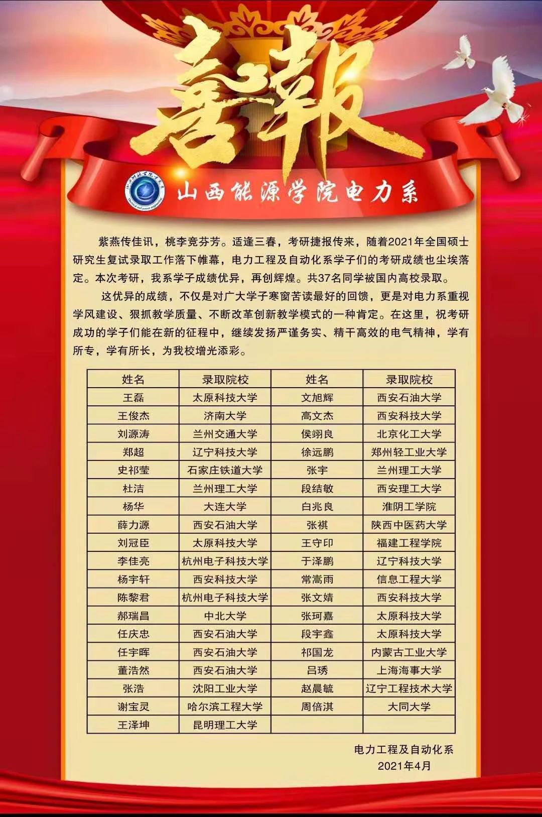 近日,2021年全国硕士研究生复试录取结果陆续公布,我系2021届毕业生在考研中取得了傲人成绩,特在此发文与全系学子分享这一喜讯!