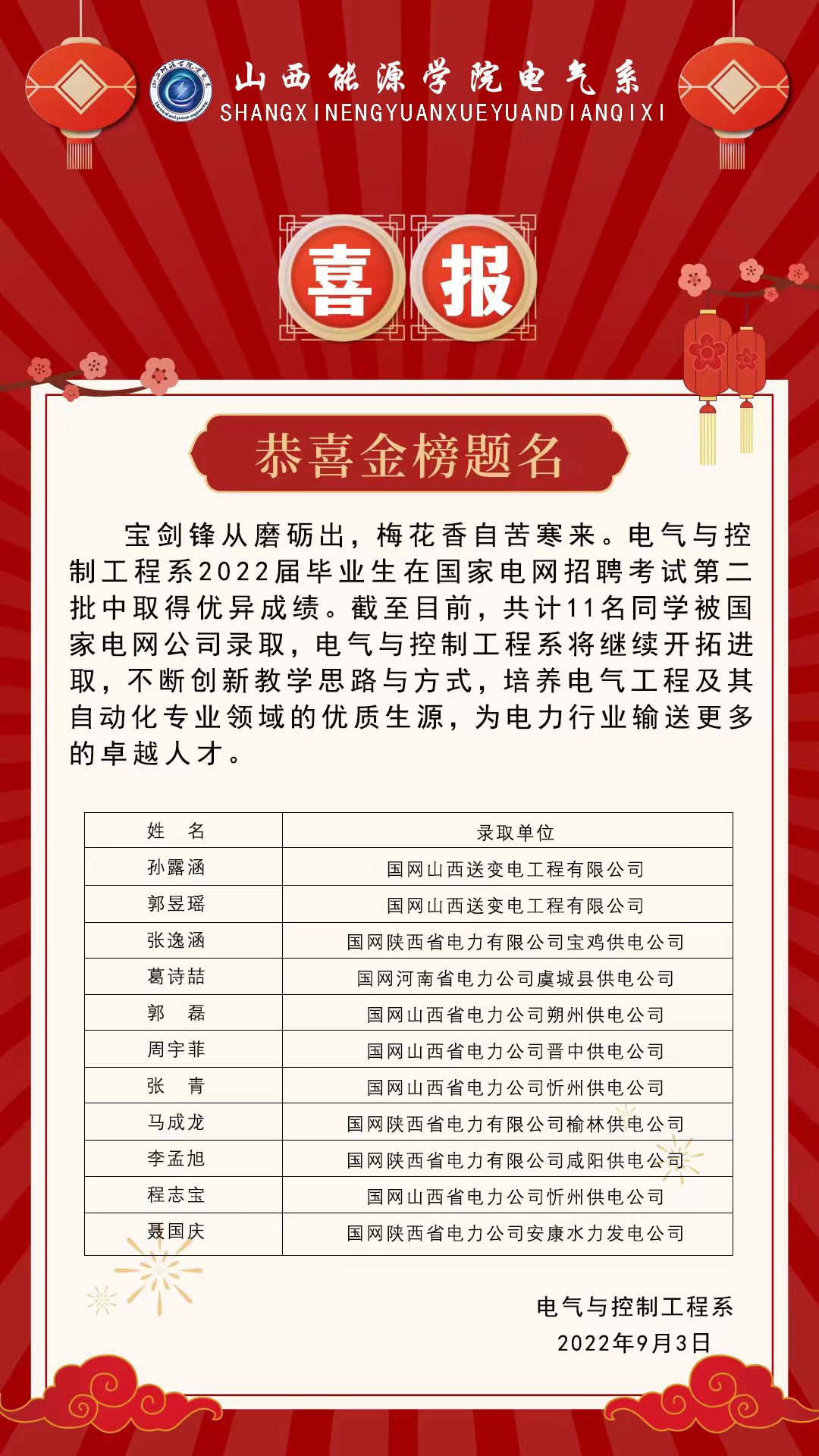 电气与控制工程系2022届毕业生国网第二批录取喜报传达
