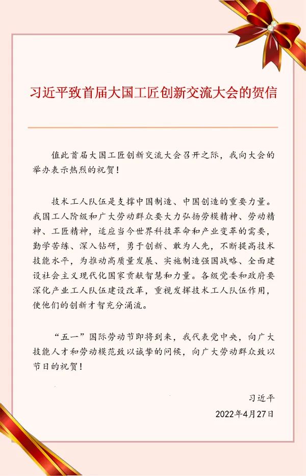 习近平在贺信中强调,技术工人队伍是支撑中国制造、中国创造的重要力量。我国工人阶级和广大劳动群众要大力弘扬劳模精神、劳动精神、工匠精神,适应当今世界科技革命和产业变革的需要,勤学苦练、深入钻研,勇于创新、敢为人先,不断提高技术技能水平,为推动高质量发展、实施制造强国战略、全面建设社会主义现代化国家贡献智慧和力量。各级党委和政府要深化产业工人队伍建设改革,重视发挥技术工人队伍作用,使他们的创新才智充分涌流。
