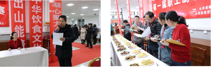 本次比赛设评委组、监审组、协调组。评委由学院劳动竞赛委员会成员担任。比赛环节由党委副书记曲晋山主持,党委书记冯锋宣布开始,院长冯国瑞宣布比赛结果。各参赛队在规定时间内,完成参赛必选菜品及自选菜品的烹饪,原本生活中常见的食材经过精心烹饪后,变成了一道道色香味俱全的美味佳肴。金玉满堂、紫气东来、腰缠万贯、事事如意……每道菜品都展现了参赛教职工们对生活的热爱和对山能的美好祝愿。