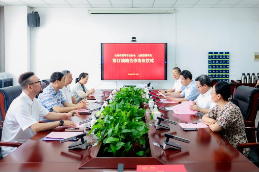 上午9点,在学校九层东会议室举办了签约及聘请客座教授仪式,中国硬笔书法协会副主席、山西省硬笔书法协会主席赵国柱、山西省硬笔书法协会党支部书记赵维勇、山西省硬笔书法协会执行主席白杰、山西省硬笔书法协会副主席武磊,山西省硬笔书法协会副主席徐晓梅、刘永安、王鑫 ,山西省硬笔书法协会副秘书长樊欣参加了仪式。TapTap党委副书记、院长冯国瑞,党委副书记曲晋山、党委副书记桑楠、党委委员、副院长刘汉涛,以及党委办公室(院长办公室),学生工作部(武装部),教务部,科技产业部(合作交流部、学报编辑部),工会,团委,思想政治理论课教学部等部门负责人出席了仪式。