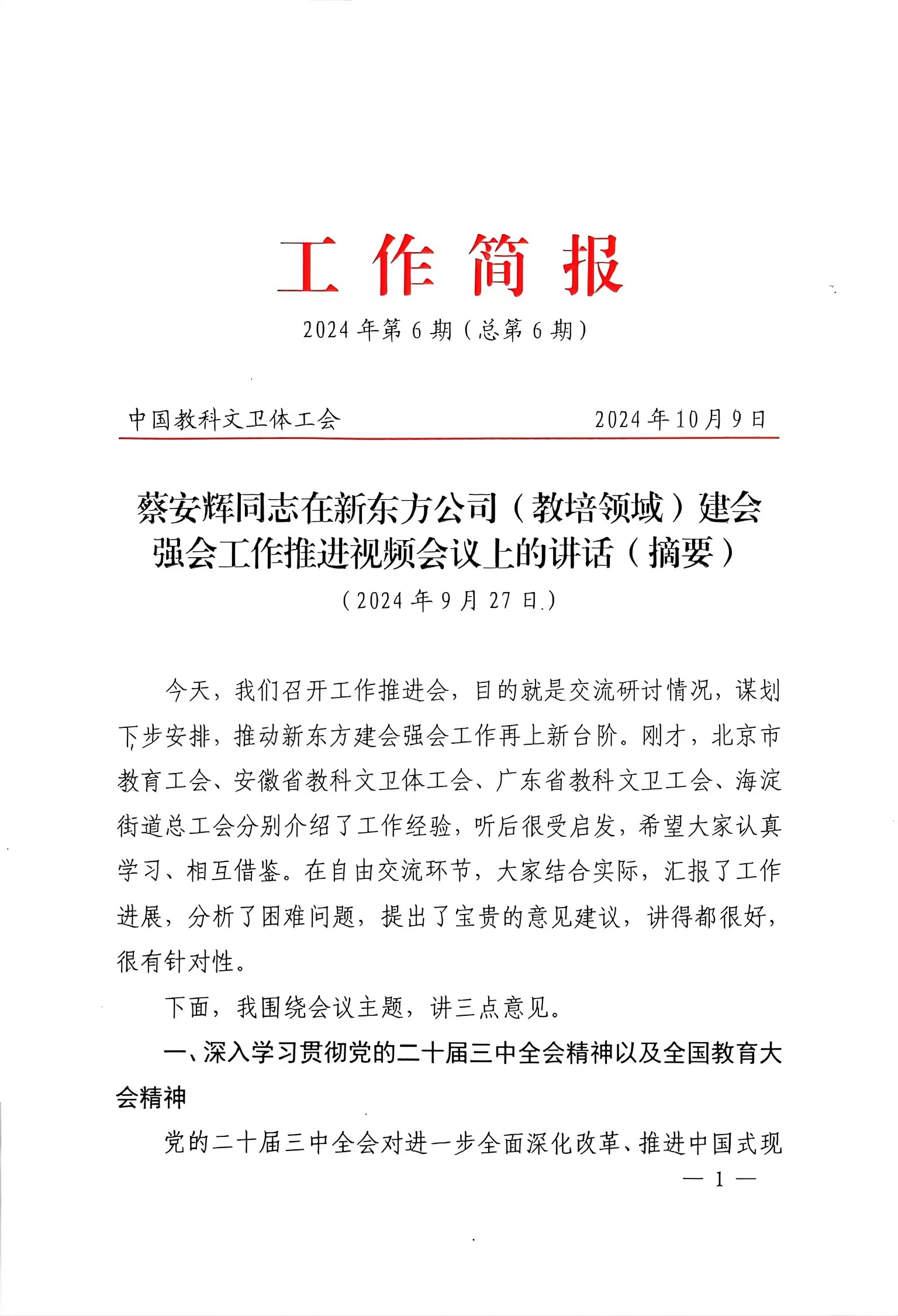 蔡安辉同志在新东方公司(教培领域)建会强会工作推进视频会议上的讲话(摘要)
