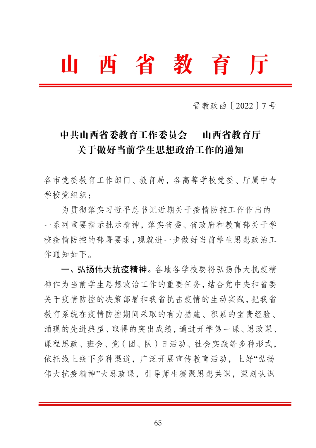 中共山西省委教育工作委员会 山西省教育厅关于做好当前学生思想政治工作的通知