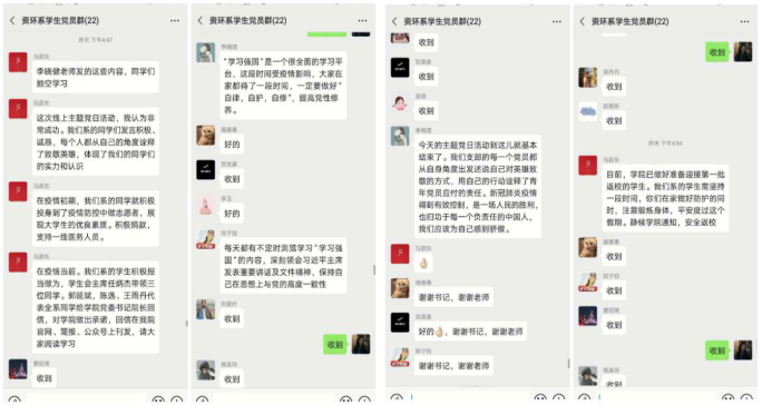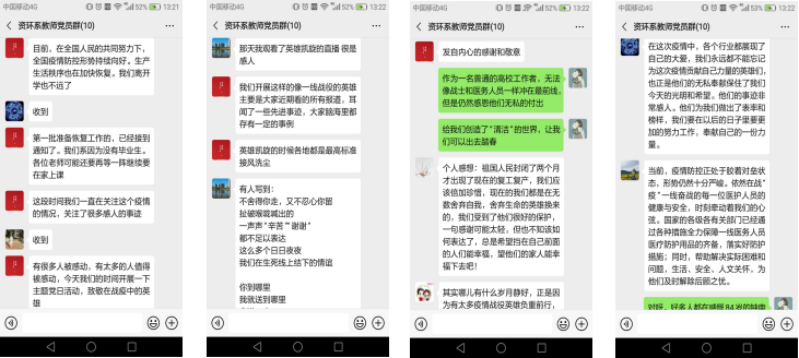 新型冠状病毒感染疫情发生以来,全国人民坚决贯彻落实习近平总书记重要指示精神和党中央决策部署,医护人员、警务人员、全国各工种人员全力以赴投入到战“疫”情、防风险、保安全、护稳定各项工作中,广大人民不畏艰险、不怕牺牲,坚守岗位、英勇奋战,涌现出许多可歌可泣的英雄事迹,更有许多医务人员、干部职工、社区工作者为抗击疫情和维护安全稳定作出了重大牺牲和奉献。国旗半垂,举国同哀,缅怀英烈,致敬英雄。针对抗“疫”战争中涌现的先进人物和感人事迹,资源与环境工程系党支部于2020年4月7日下午在教师党支部和学生党支部微信群组织开展了“致敬战“疫”英雄”主题线上党日活动,激励师生牢记入党初心与使命,忠诚履职尽责,踏着他们的足迹奋力前行,用青春践行使命,用行动实现梦想。为使主题党日活动开的成功,开出成效,总支书记马蔚东、组织员李晓建提前准备,定好主题、列出提纲,并做引领发言。