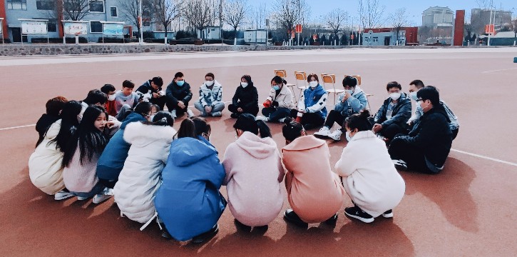 3月4日下午,天气晴朗,学院操场一角,系党总支书记马蔚东、专职辅导员田晓晖和贺慧老师与同学们围坐一圈,和大家开始交流。在此之前,书记和两位辅导员为这次活动也做了充分的准备,设想和同学们交流内容,但封闭管理期间我们最需要知道和了解的是学生的情绪、需求和心声——这样才能更好地帮助学生将有效的时间走进图书馆徜徉在书海之中;奔跑在操场上挥洒在汗水中;飞扬在舞台上展现青春的色彩中……