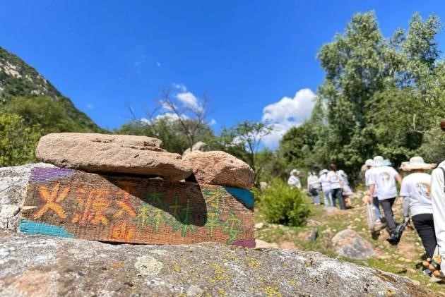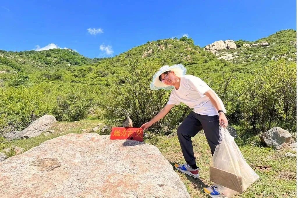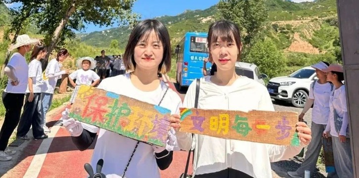 在上山途中,同学们一边放置标志牌,一边清理沿途废弃垃圾,用实际行动倡导环保理念,谱写环保志愿服务新篇章。