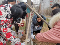 “与时俱进跟党走,志愿服务献青春。”即使寒风扑面,也挡不住我们党员前进的步伐。下午3点30分,党员同志们在综合楼北门前集合,后勤工作人员为党员同志们分配好了刷漆工具。领导班子成员率先垂范,全体党员表现出极大的热情。大家三三两两聚拢在树旁,用准备好的刷子蘸上石灰水,认真细致得为每一棵树木裹上一层银白的外衣。