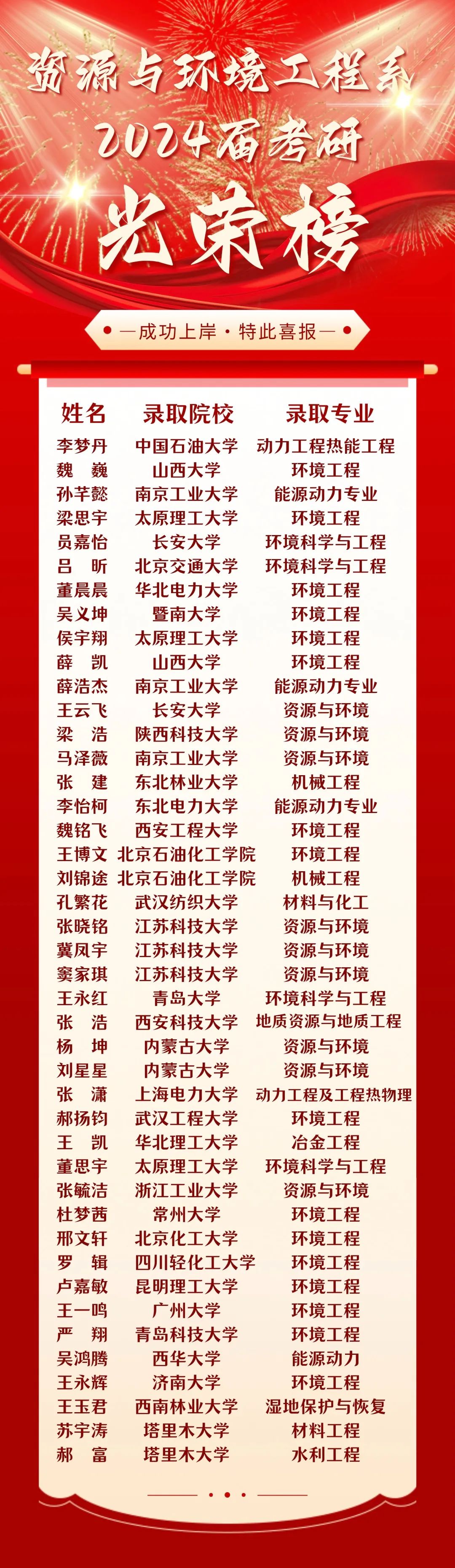 这是一场盛大的梦,从春开始编织,在凛冬盛开。他们走过贫瘠沼泽,与万籁群峰,他们日夜仰望着山巅光景,终成触手可得的星空。在人生的浩瀚画卷中,考研是那一抹绚丽而深刻的笔触。那一盏盏深夜仍倔强亮起的灯光,勾勒出奋斗者坚韧的轮廓;那一本本被岁月摩挲的书籍,沉淀着追梦人执着的信念。当 2024 年全国硕士研究生招生录取工作落下帷幕之际,资源与环境工程系的考研学子们喜讯接踵而至!