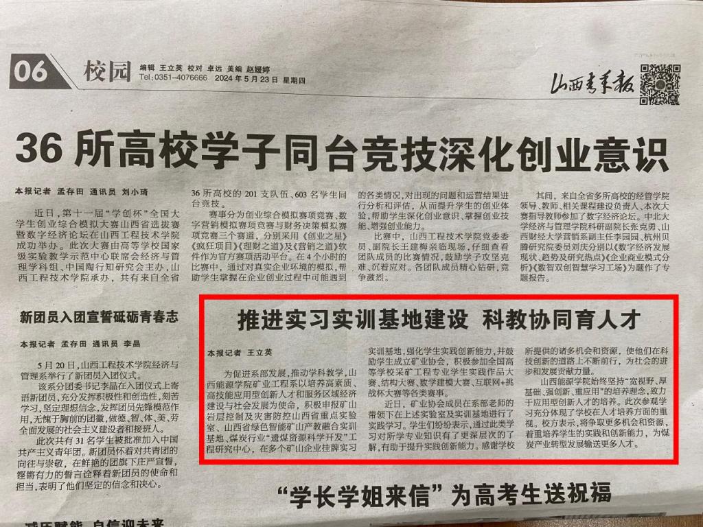 2024年5月23日《山西青年报》06版刊登了题为“推进实习实训基地建设 科教协同育人才”的报道。