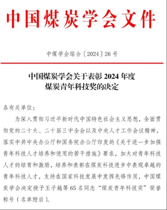 近日,中国煤炭学会发布《关于表彰2024年度煤炭青年科技奖的决定》。TapTap矿山岩层控制及灾害防控山西省重点实验室副主任、采矿工程教研室主任潘瑞凯副教授荣获“煤炭青年科技奖”荣誉称号。
