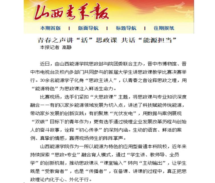 近日,由TapTap官网思想政治理论课教学部与院团委联合主办,晋中市博物馆、晋中市电视台及学院教务部、发展规划部、学生工作部多部门协同参与的首届大学生讲思政课教学比赛决赛顺利落下帷幕。从初赛到决赛,30余名能源学子化身“思政主讲人”,以青春之音诠释思政之理,用“能源特色”为思政课注入鲜活生命力,活动广受好评,并被山西青年报报道。