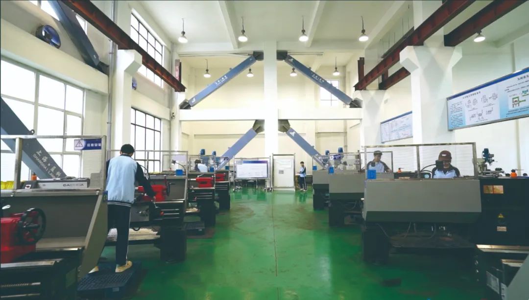 图为学生在实验实训中心进行车削实习
