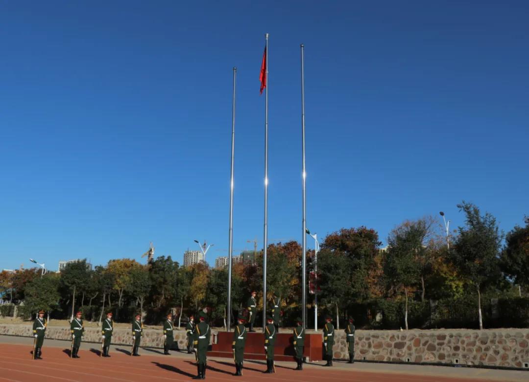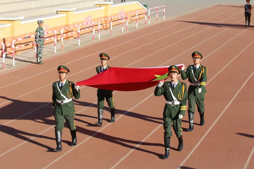 国旗护卫队将国旗护送至升旗仪式台前,伴随着庄严雄壮的国歌声,五星红旗冉冉升起。