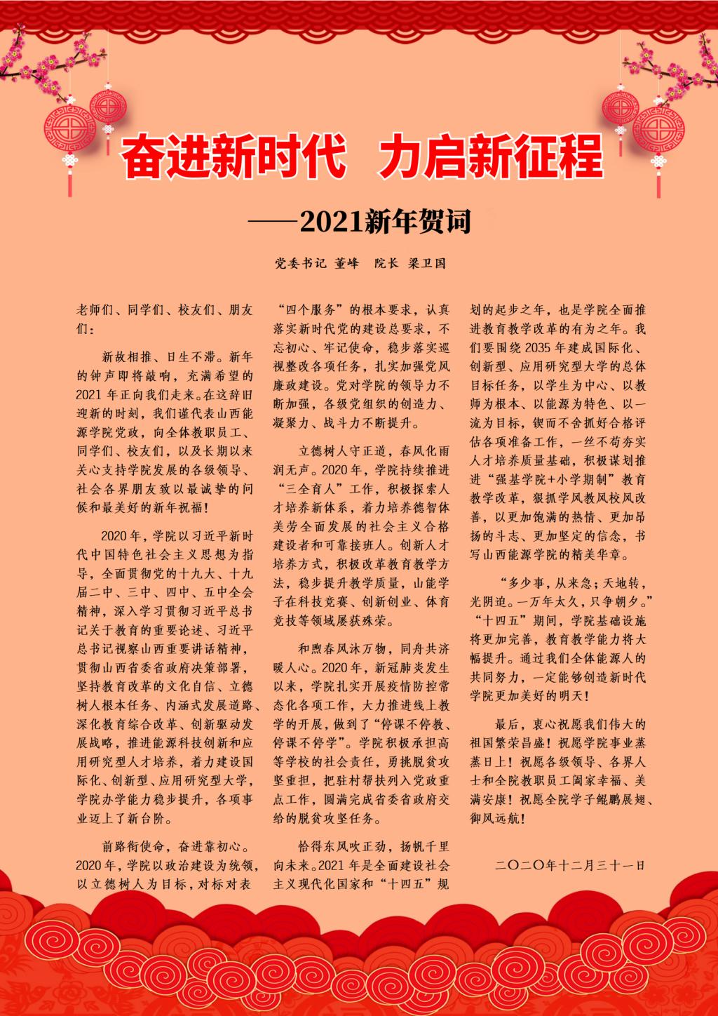 恰得东风吹正劲,扬帆千里向未来。2021年是全面建设社会主义现代化国家和“十四五”规划的起步之年,也是学院全面推进教育教学改革的有为之年。我们要围绕2035年建成国际化、创新型、应用研究型大学的总体目标任务,以学生为中心、以教师为根本、以能源为特色、以一流为目标,锲而不舍抓好合格评估各项准备工作,一丝不苟夯实人才培养质量基础,积极谋划推进“强基学院+小学期制”教育教学改革,狠抓学风教风校风改善,以更加饱满的热情、更加昂扬的斗志、更加坚定的信念,书写TapTap官网的精美华章。