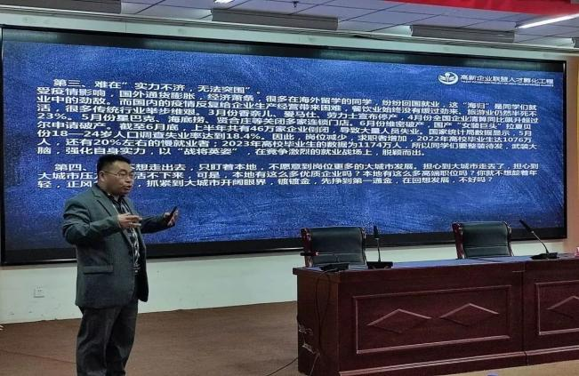 北京软峰时代科技有限公司副总裁、大学生就业指导规划师顾鹏老师以“临近毕业,同学们该何去何从”为主题为同学们进行了就业指导。他表示,当前大学生普遍存在缺乏职业规划、职业能力不强等问题,在求职人数增多、竞争压力增大的现状下,同学们要夯实基础,掌握技能,在确定奋斗目标后积极就业,勇往直前。