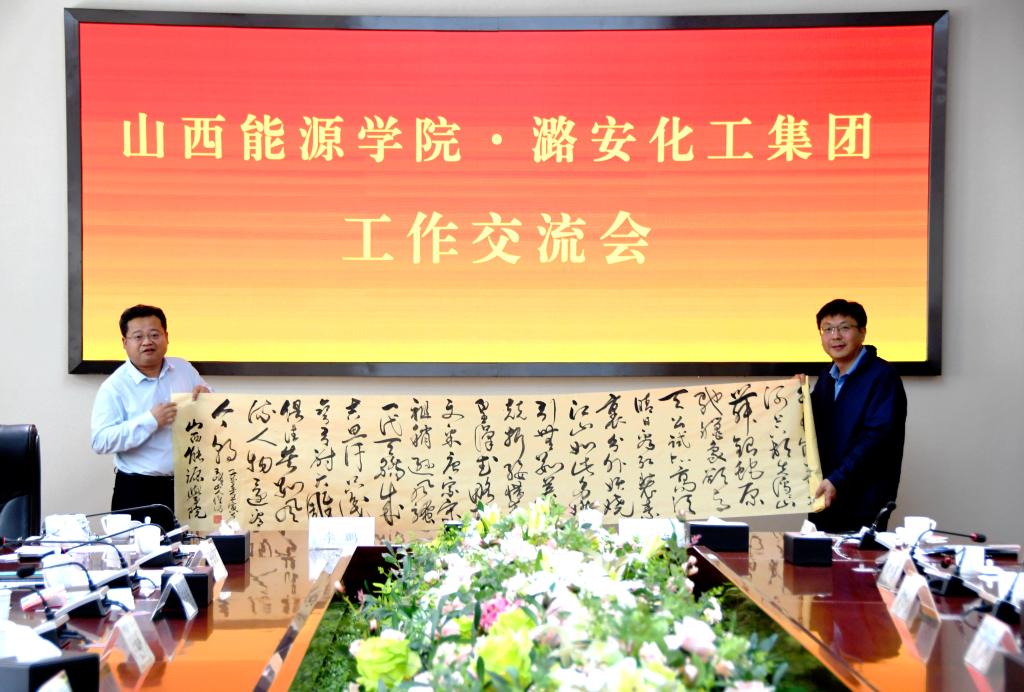 会后,冯国瑞副院长(主持行政工作)在与会人员的共同见证下,代表学校向潞安化工集团赠送了TapTap教师创作的书法作品。