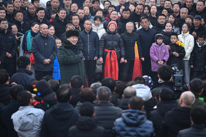 1月26日至27日,中共中央总书记、国家主席、中央军委主席习近平来到山西,看望慰问基层干部群众。这是26日下午,习近平在临汾市汾西县僧念镇段村文化广场,给乡亲们拜年,向全国各族人民、向港澳台同胞和海外侨胞致以美好的新春祝福。新华社记者 李学仁 摄