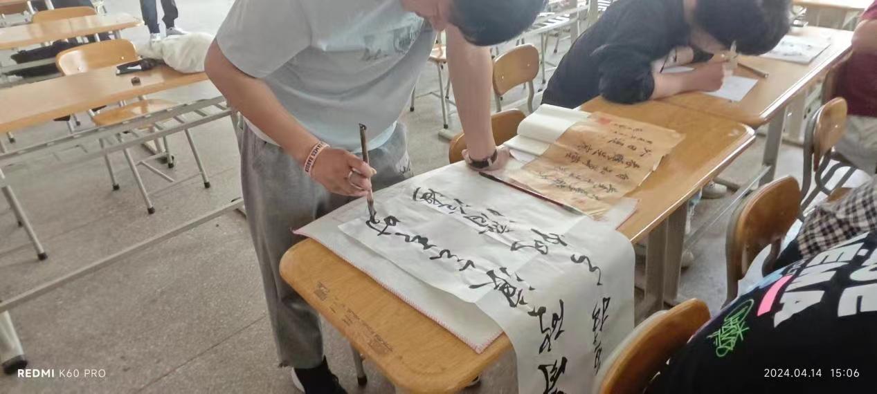 教室布置典雅,满了书香气息。参赛同学们精神饱满,高涨纷纷拿出自己的本领用毛笔在纸上书写经典文。他们字迹清秀飘逸,或刚劲有力,一笔、划都凝聚着对书法艺术的热爱追求