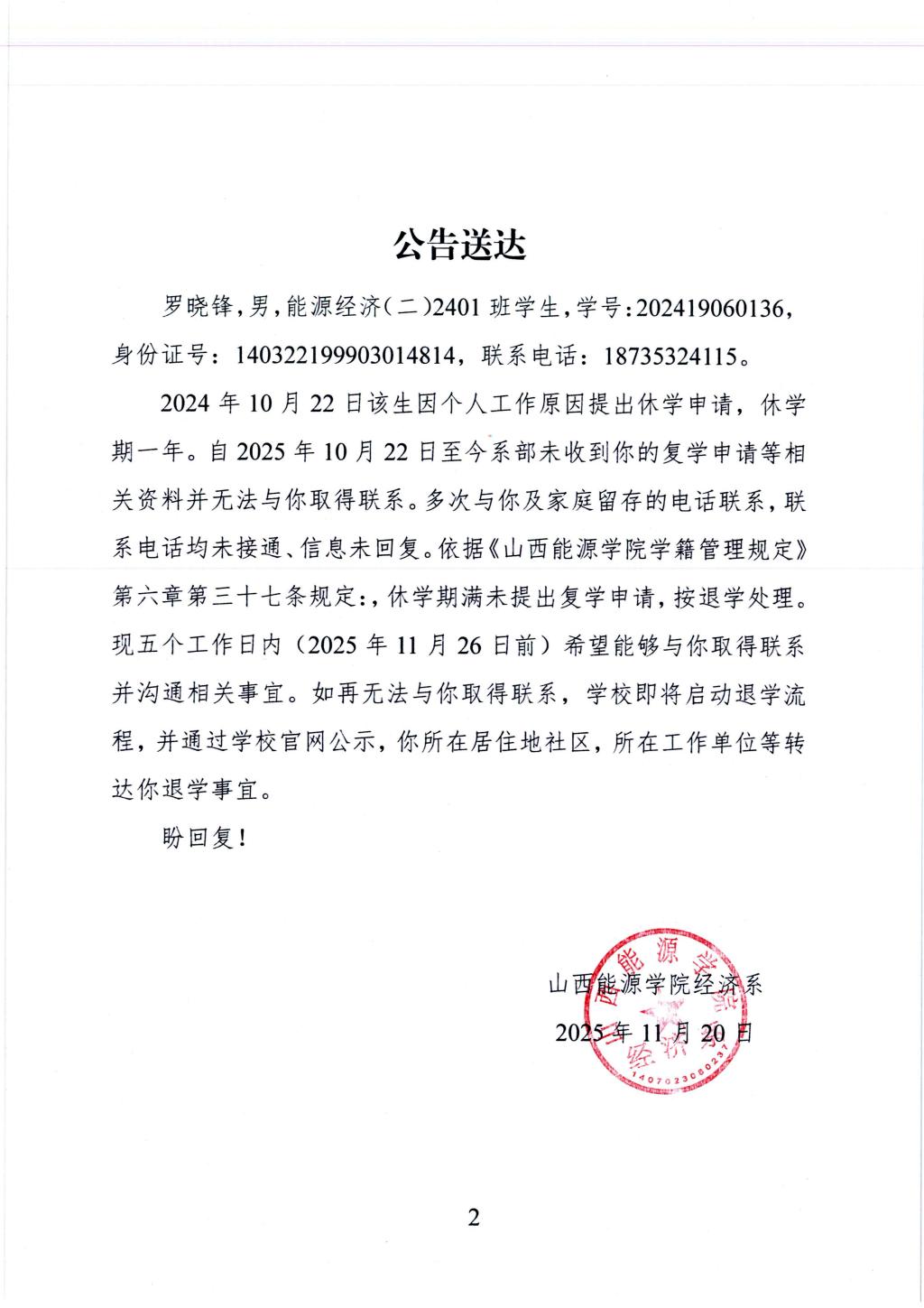 关于向休学期满的学生常亮、罗晓锋催办复学事宜进行公告送达的通知