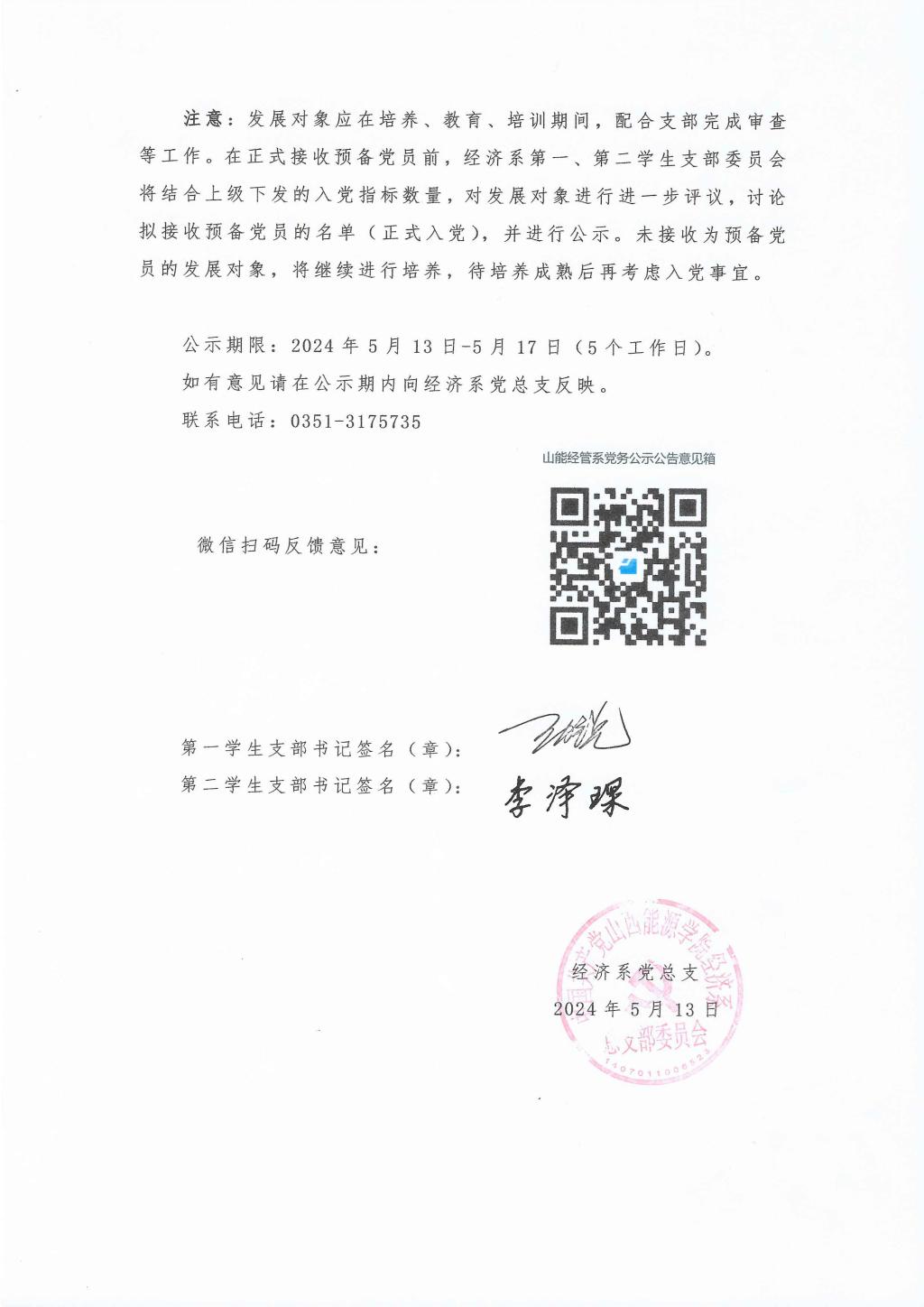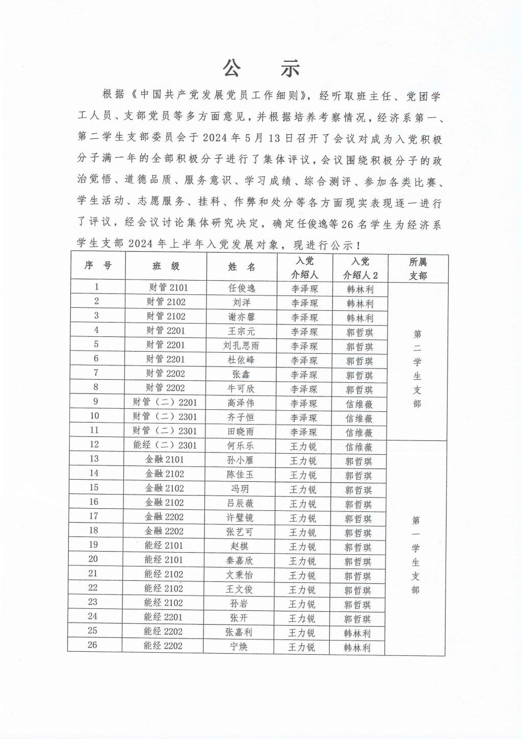经济系2024年上半年入党发展对象名单公示