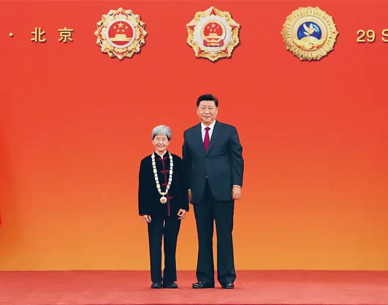2019年9月29日,中华人民共和国国家勋章和国家荣誉称号颁授仪式在北京人民大会堂金色大厅隆重举行。中共中央总书记、国家主席、中央军委主席习近平向“文物保护杰出贡献者”国家荣誉称号获得者樊锦诗颁授奖章。新华社记者 王晔/摄