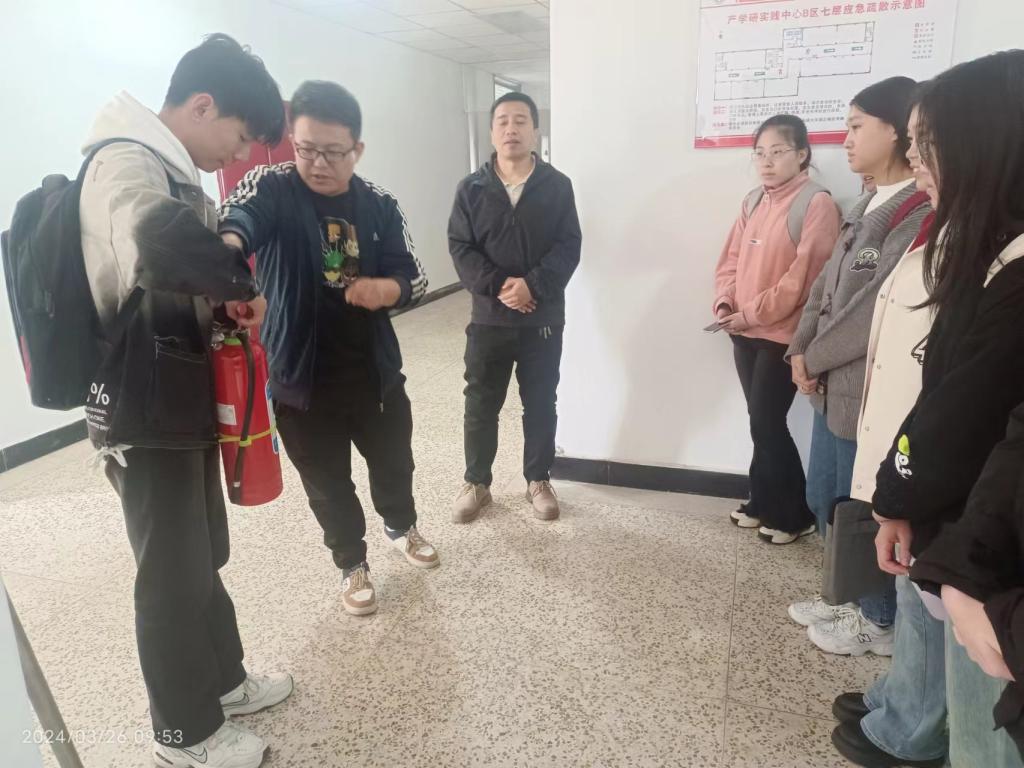 疏散结束后,保卫处的老师随机挑选了一名男生进行灭火器使用手法的提问。通过互动问答的形式,不仅检验了同学们对消防知识的掌握情况,也进一步加深了大家对灭火器使用方法的理解。随后,保卫处的老师为大家进行了专业的灭火器培训教学,详细介绍了灭火器的种类、使用方法及注意事项,并现场演示了灭火器的正确操作。