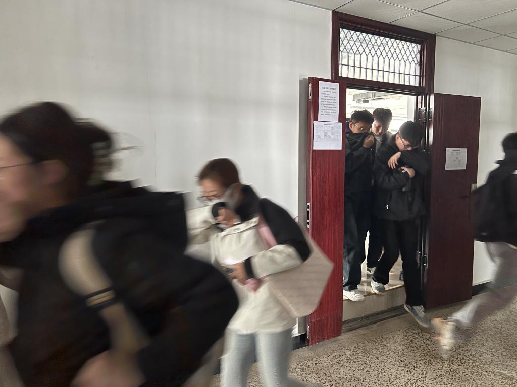 随着周老师播放消防警报,实验楼内顿时响起刺耳的警报声。同学们迅速按照预定的疏散路线,从实验楼八层开始紧急疏散逃生。在逃生过程中,同学们纷纷模仿用湿毛巾捂住口鼻,低头弯腰,有序地撤离到安全区域。保卫处的老师们则在各个关键节点进行指引和疏导,确保疏散过程的安全有序。