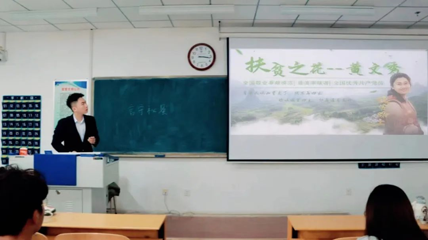 学生党员白志武以《扶贫之花—黄文秀》为题,通过讲述黄文秀的故事,他希望学员们能够深刻感受到共产党员的初心和使命,以及扶贫干部的责任和担当,在新时代中我们应该以黄文秀为榜样,勇担使命为实现中华民族伟大复兴的中国梦贡献自己的力量!