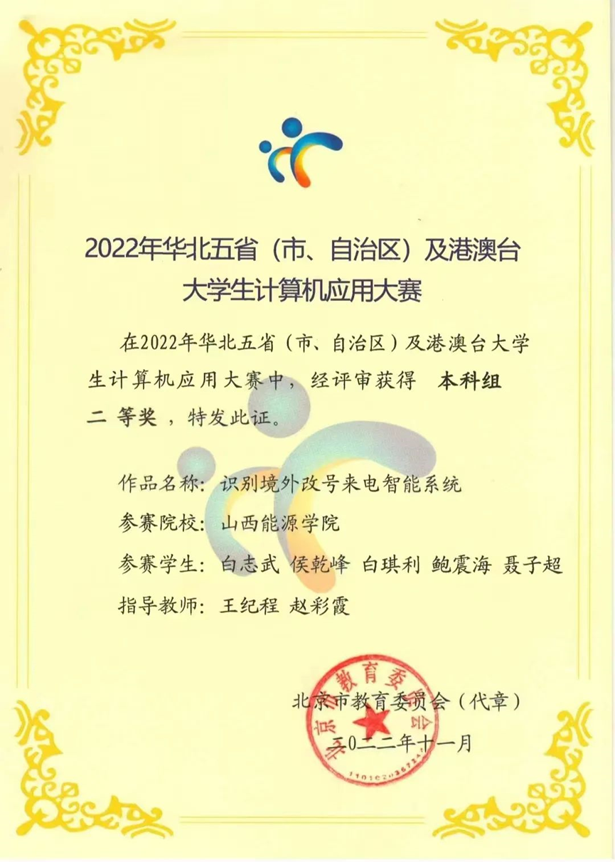 2022年华北五省及港澳台大学生计算机应用大赛本科组二等奖:白志武、侯乾峰、白琪利、鲍震海、聂子超。