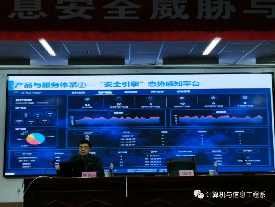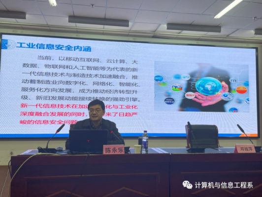 新一代信息技术在加速信息化与工业化深度融合发展的同时,也带来了日趋严峻的工业信息安全问题。结合当今大数据工业信息全覆盖的发展现状,为使我系学生对自己所学的专业知识与工业信息安全发展有更加深入的了解,我系邀请太原理工大学的陈永乐教授于11月18日晚19点整在综三阶举办了《工业信息安全威胁与防护》学术讲座。本次讲座由系主任邓越萍主持,系党总支书记刘三川、系教学负责人史明、专职辅导员梁成君、专职辅导员赵彩霞、专职组织员周晓洁、专职教师周云飞、王纪程以及我系20级学生参加讲座。其他系老师与学生也积极参加并互动。
