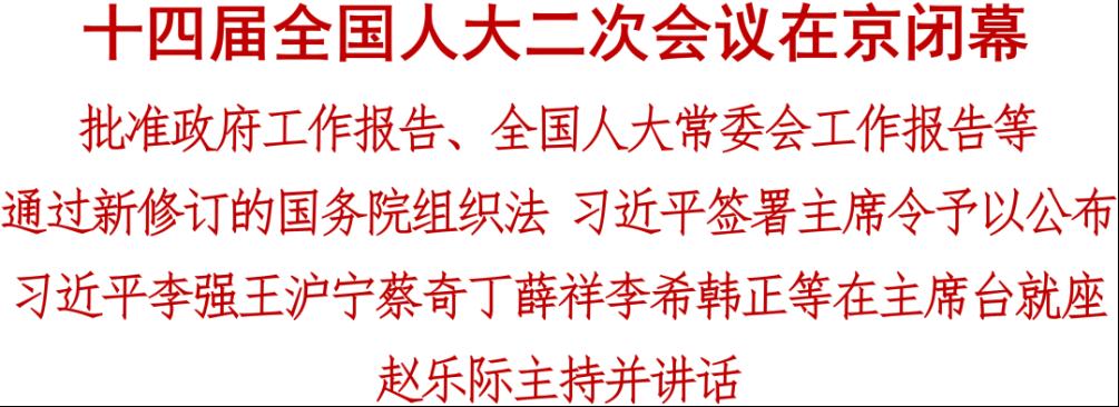第十四届全国人民代表大会第二次会议在圆满完成各项议程后,11日下午在北京人民大会堂闭幕。大会批准政府工作报告、全国人大常委会工作报告等。大会通过新修订的国务院组织法,国家主席习近平签署第21号主席令予以公布。