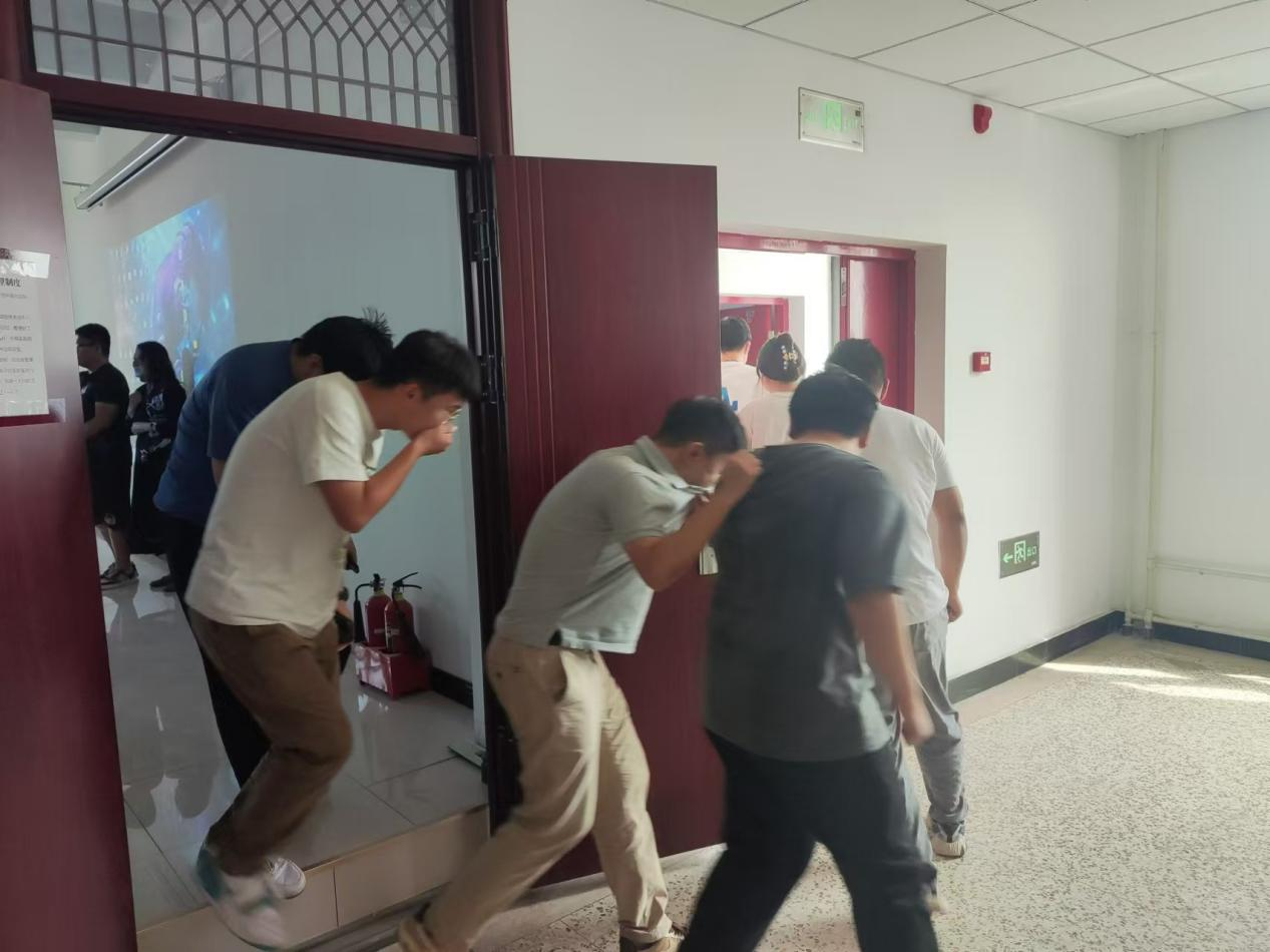 活动开始,同学们随着消防警报的声音响起,迅速按照预定的疏散路线,从实验楼八层开始紧急疏散逃生。逃生过程中大家纷纷模仿湿毛巾捂住口鼻,低头弯腰,有序地撤离到安全区域。保卫处张永生老师则在各个关键节点进行指引和疏导,确保疏散过程的安全有序。