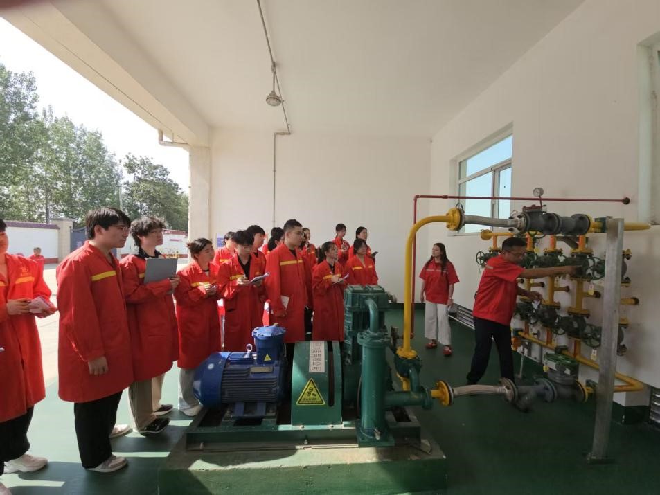 在帅安液化石油气有限公司,学生们学习了液化石油气的储存、加压、气化及外输的全过程。面对复杂的设备,学生们积极提问并记录流程要点,例如充装前气瓶残液的处理方法以及气瓶充装量的标准。液化石油气在低温高压条件下被安全地储存在储罐中,需要时通过泵加压送入气化器,气化后再通过管道输送到用户端。整个流程严谨而高效,体现了油气储运工程的专业性和安全性。