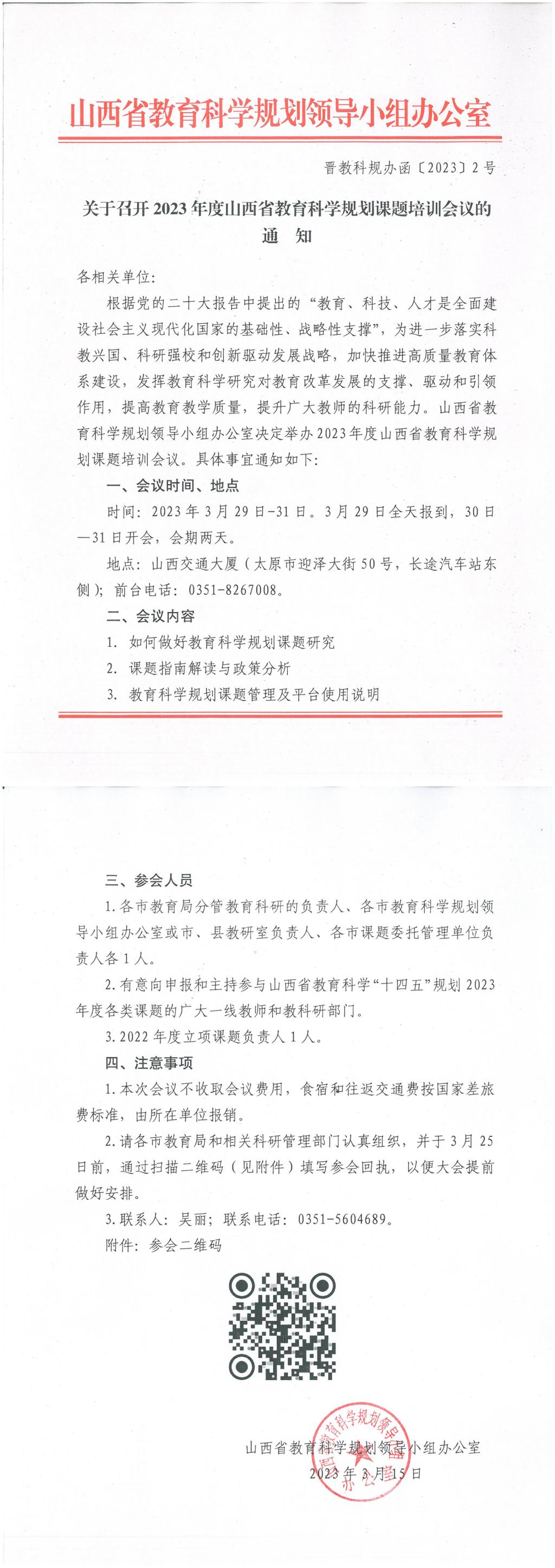 山西省教育科学规划领导小组办公室决定于2023年3月29日-31日举办2023年度山西省教育科学规划课题培训会议,具体培训要求如下,请参会老师及时填写参会回执,并按时参会