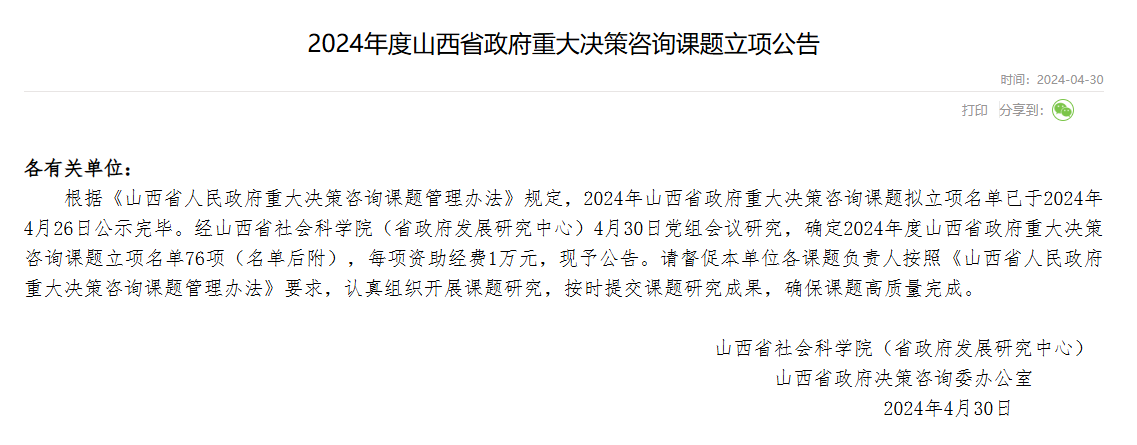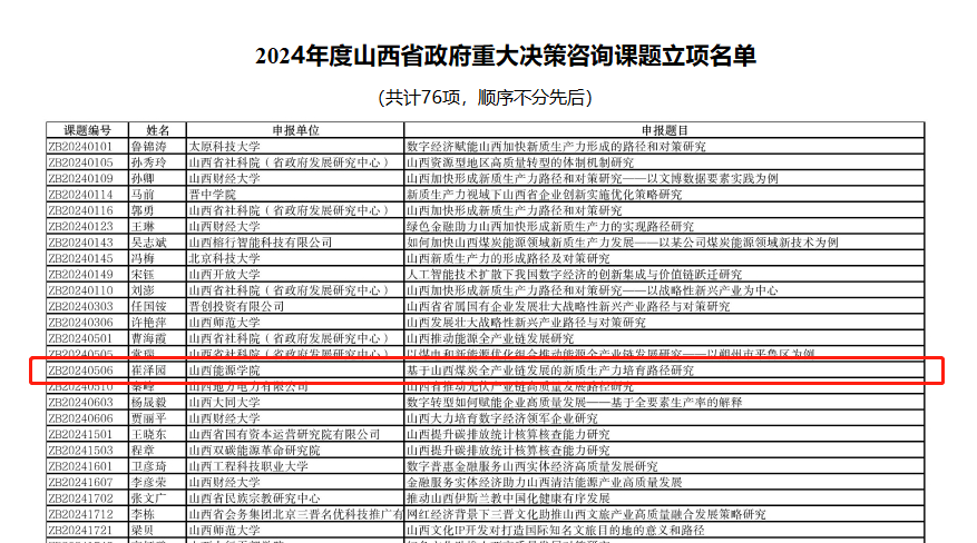 近日,山西省社会科学院(省政府发展研究中心)山西省政府决策咨询委办公室发布了2024年度山西省政府重大决策咨询课题立项公告,全省共76个项目立项。TapTap崔泽园副教授主持的《基于山西煤炭全产业链发展的新质生产力培育路径研究》获批立项。