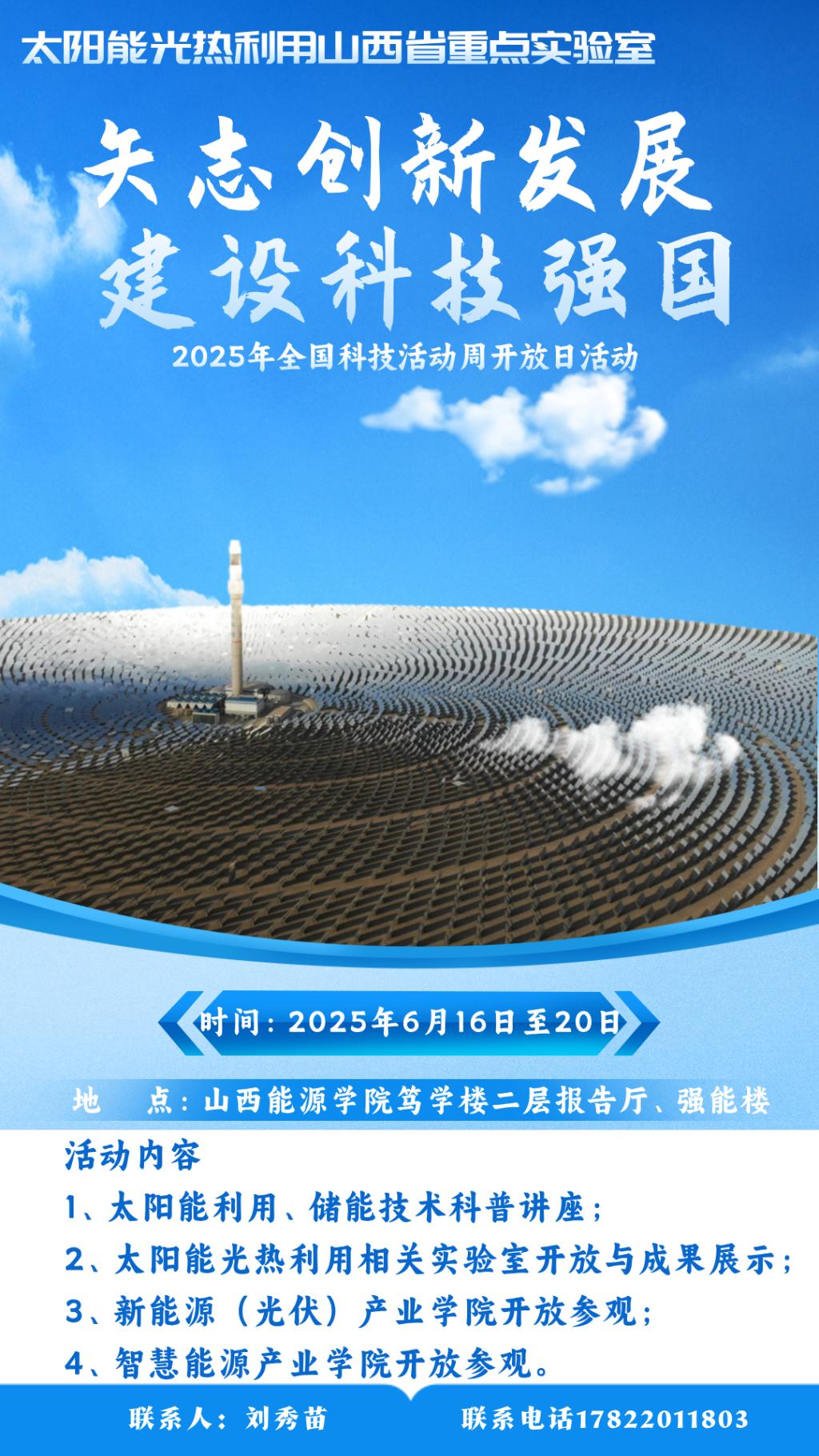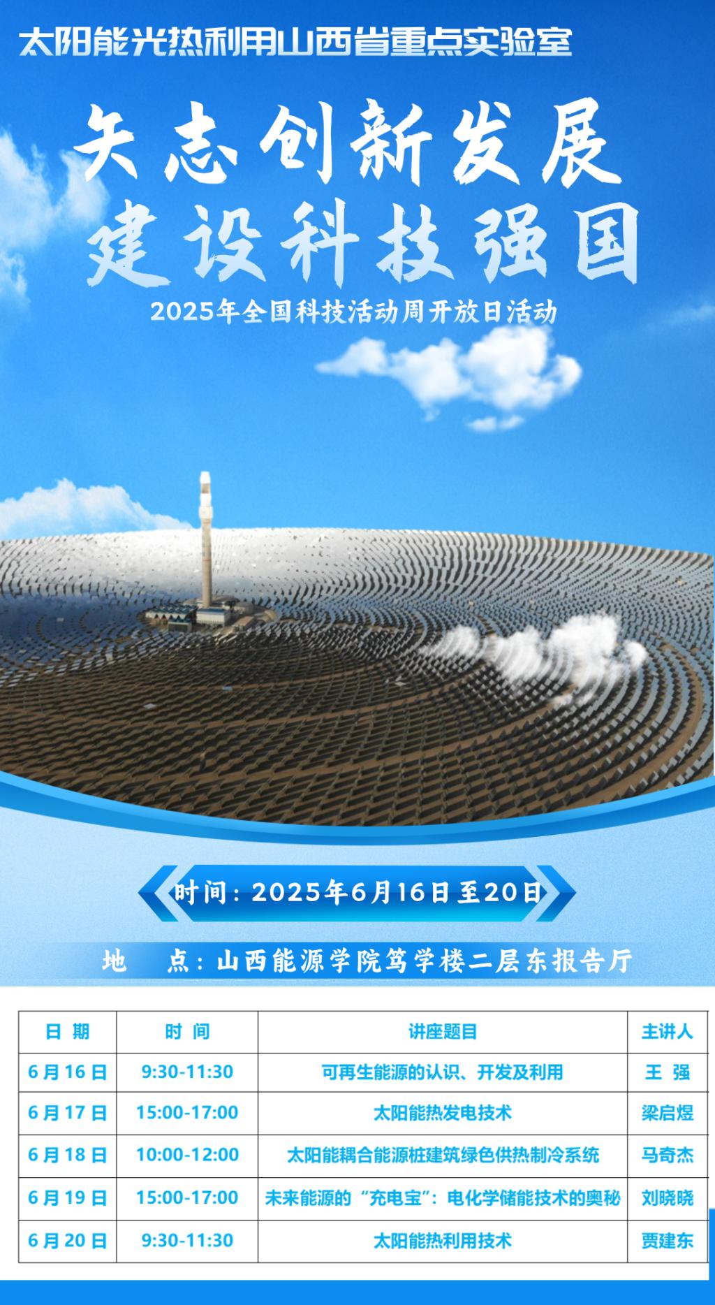 为贯彻落实山西省科技厅《关于举办2025年全国科技活动周和科技工作者日活动的通知》精神,弘扬科学家精神,致敬科技工作者,普及太阳能相关科技知识,太阳能光热利用山西省重点实验室定于2025年6月16日至20日举办开放周活动。