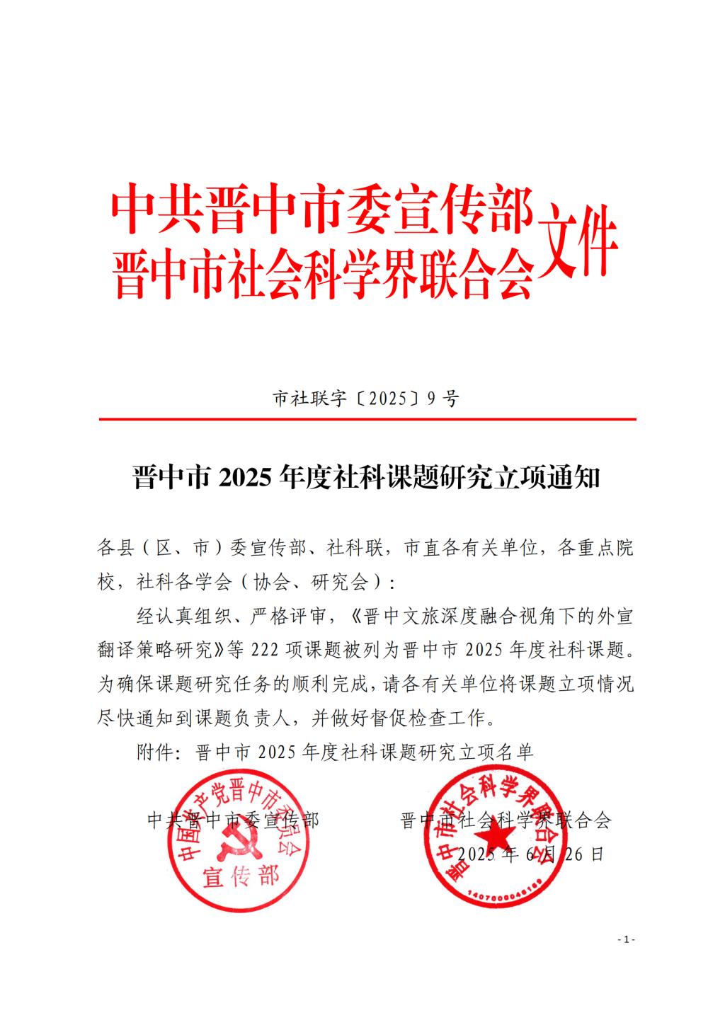 近日,中共晋中市委宣传部、晋中市社会科学界联合会联合发布了《晋中市 2025 年度社科课题研究立项通知》,TapTap4项项目获批立项。
