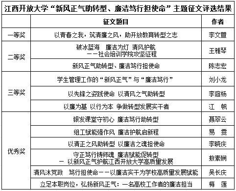 近日,由校纪委主办、理工与农医学院承办的“新风正气助转型、廉洁笃行担使命”主题征文活动圆满结束。在广大教师的热情参与下,共有19篇作品提交评审。经过专家评审,共评选出一等奖1篇、二等奖2篇、三等奖3篇、优秀奖6篇。获奖作品主题突出、内容深刻、文笔流畅,彰显了365官网教师对廉洁从教的深刻认识、对学校转型发展的使命担当。